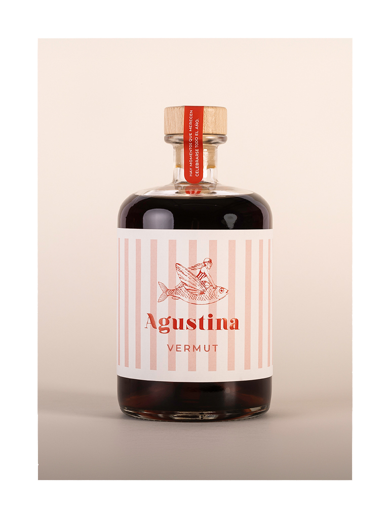 Botella AGUSTINA VERMUT. Agustina es un vermut elegante. Está elaborado con una formulación de más de 80 años a la que se añaden más de 20 hierbas aromáticas y especias entre las que destacan: artemisa, genciana, mejorana, coriandro, orégano, salvia, cardamomo, canela y regaliz.