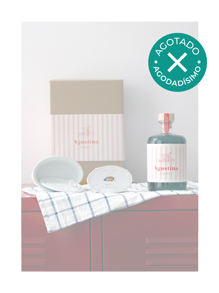 Un regalazo con lo imprescindible para hacer un piscolabis: Agustina Vermut, una latica de mejillones para acompañarlo y un recipiente de porcelana la mar de chulo para presentarlo.