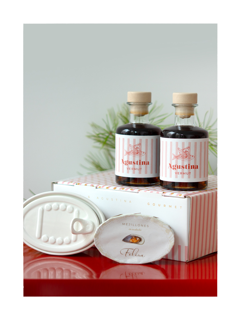 Este pack incluye lo imprescindible para hacer una hora del vermut como tiene que ser: Agustina Vermut, una latica de mejillones para acompañarlo y un recipiente de porcelana la mar de chulo para presentarlo.